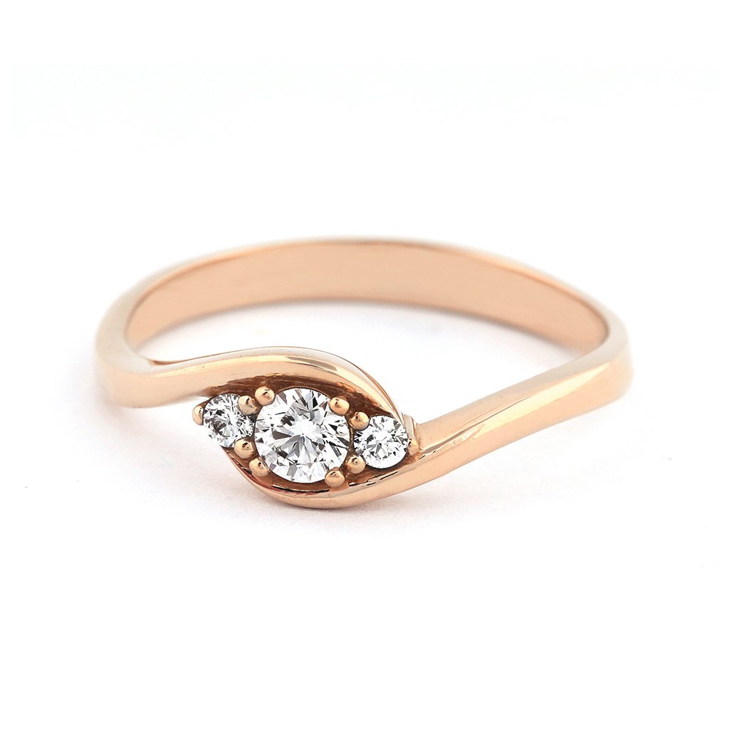 Elegantní prsten z růžového zlata zdobený centrálním briliantem a dvěma menšími diamanty v jemné, plynulé linii. Něžný třpyt, moderní design a nadčasová ženskost.