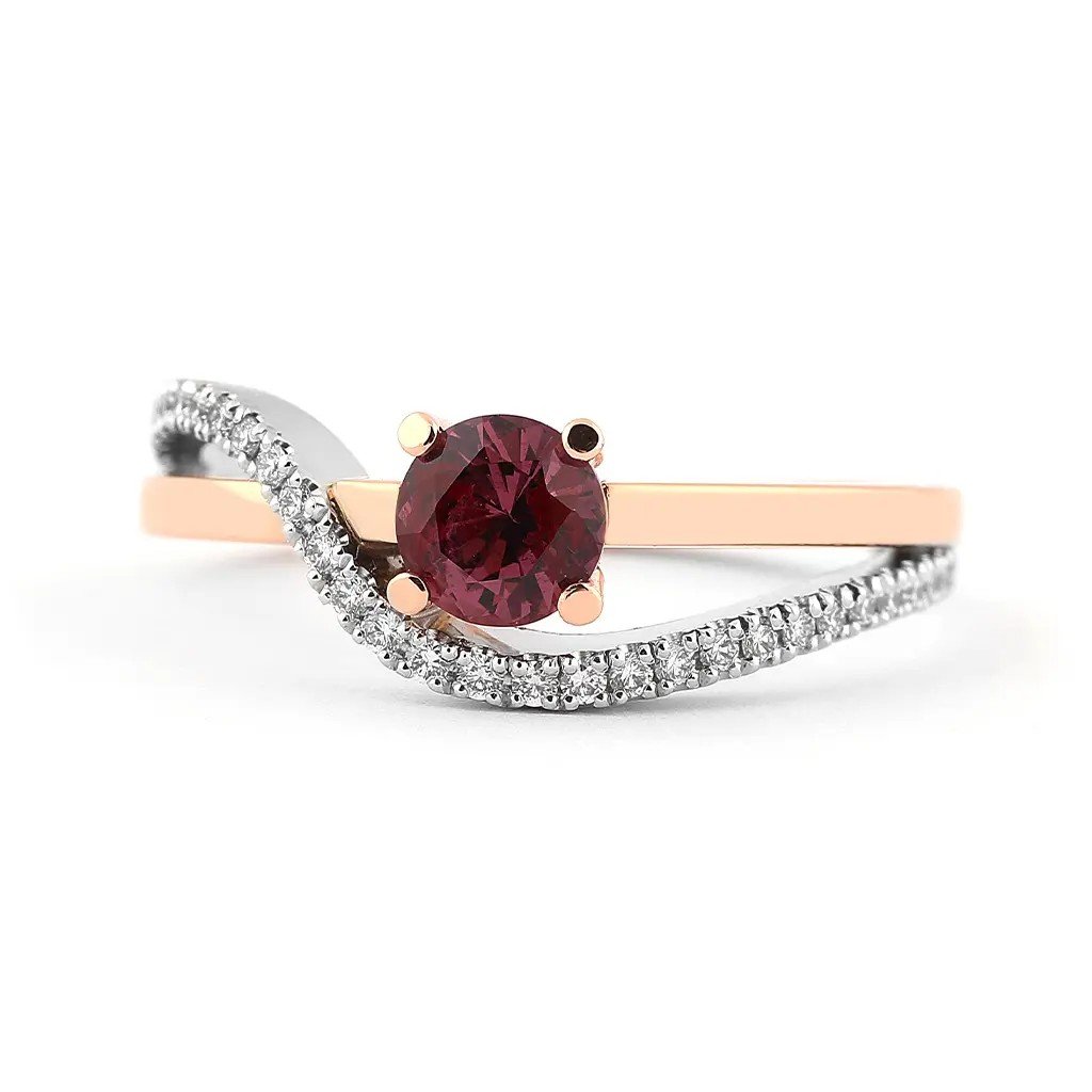 Moderní prsten z bílého a červeného zlata s purpurově červeným spinelem a třpytivými diamanty v netradičním designu.
