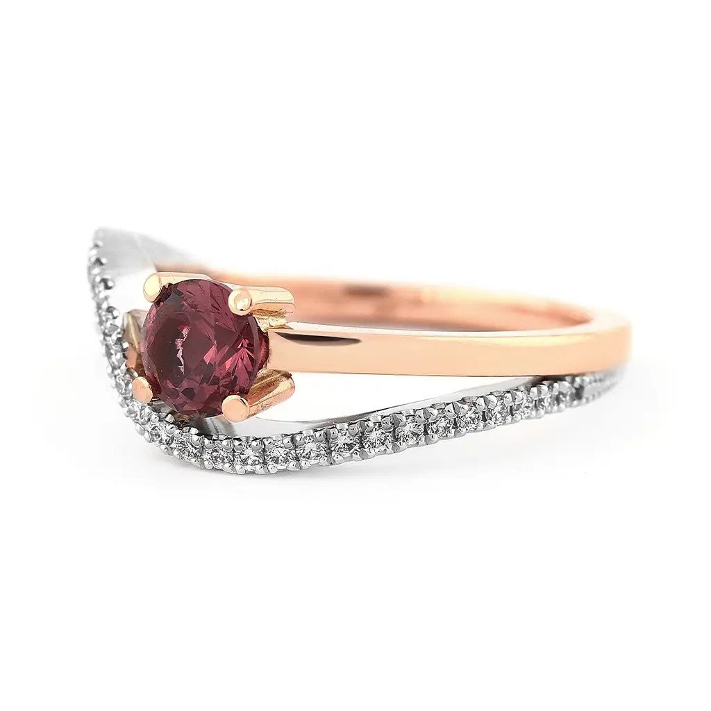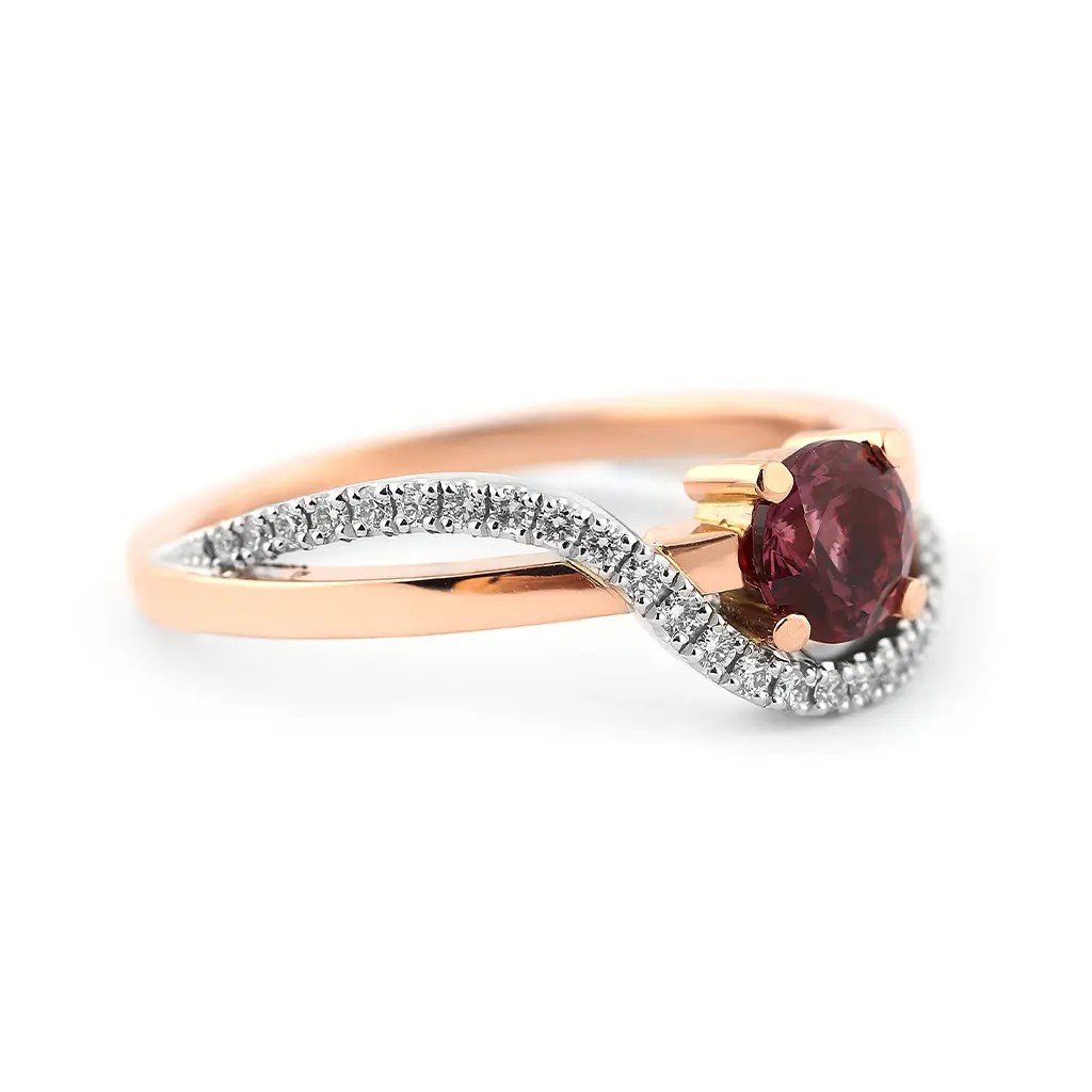 Tento moderní prsten je důkazem toho, že krása vzniká v kontrastech. Kombinace bílého a růžového zlata působí odvážně a originálně, díky čemuž se šperk stává nepřehlédnutelným doplňkem. Hlavní roli zde hraje přírodní spinel s brusem kulatého briliantu, jehož načervenale purpurový odstín symbolizuje vášeň a noblesu. Kámen o průměru 5,1 mm a hmotnosti 0,618 ct je transparentní a přitahuje pozornost svou hloubkou barvy.