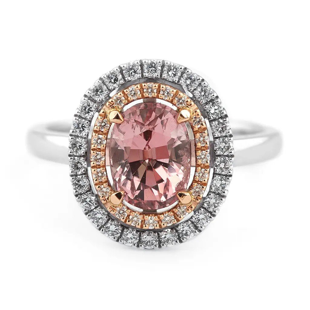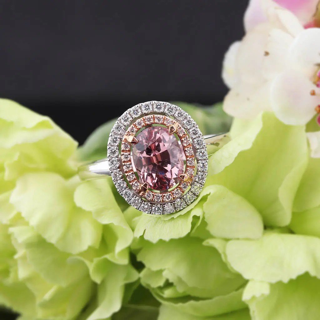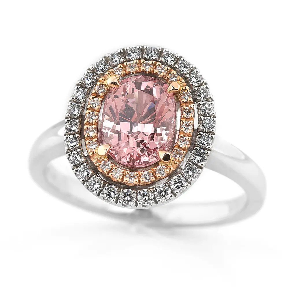 Romantický prsten s růžovým spinelem a dvojitým diamantovým orámováním v kombinaci bílo růžového zlata, vel. 56