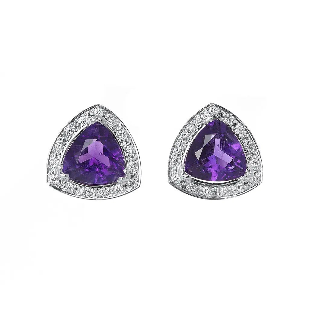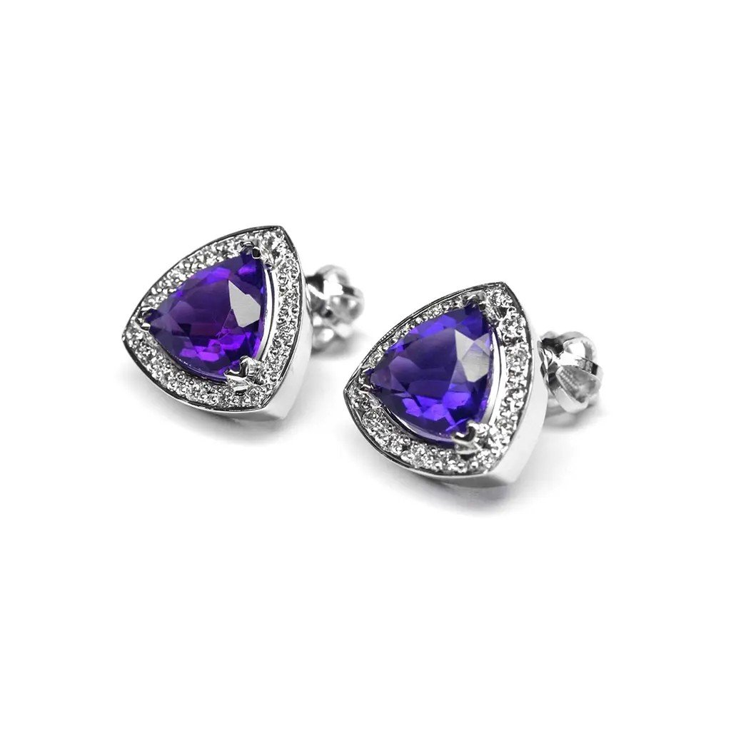 Okouzlující náušnice z bílého zlata 585/1000 v sobě snoubí jemnost ruční práce a vznešený třpyt přírodních drahokamů. Dominantou každé náušnice je ametyst v triliantovém brusu o velikosti přibližně 7,5 mm a celkové hmotnosti 2,743 ct. Jeho sytě fialová barva podtrhuje ženskou eleganci a působí harmonicky a tajemně.