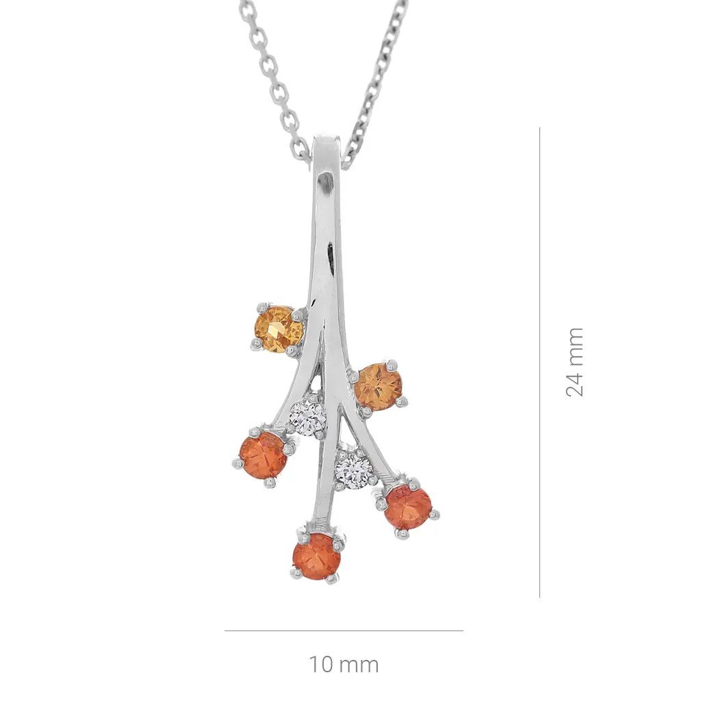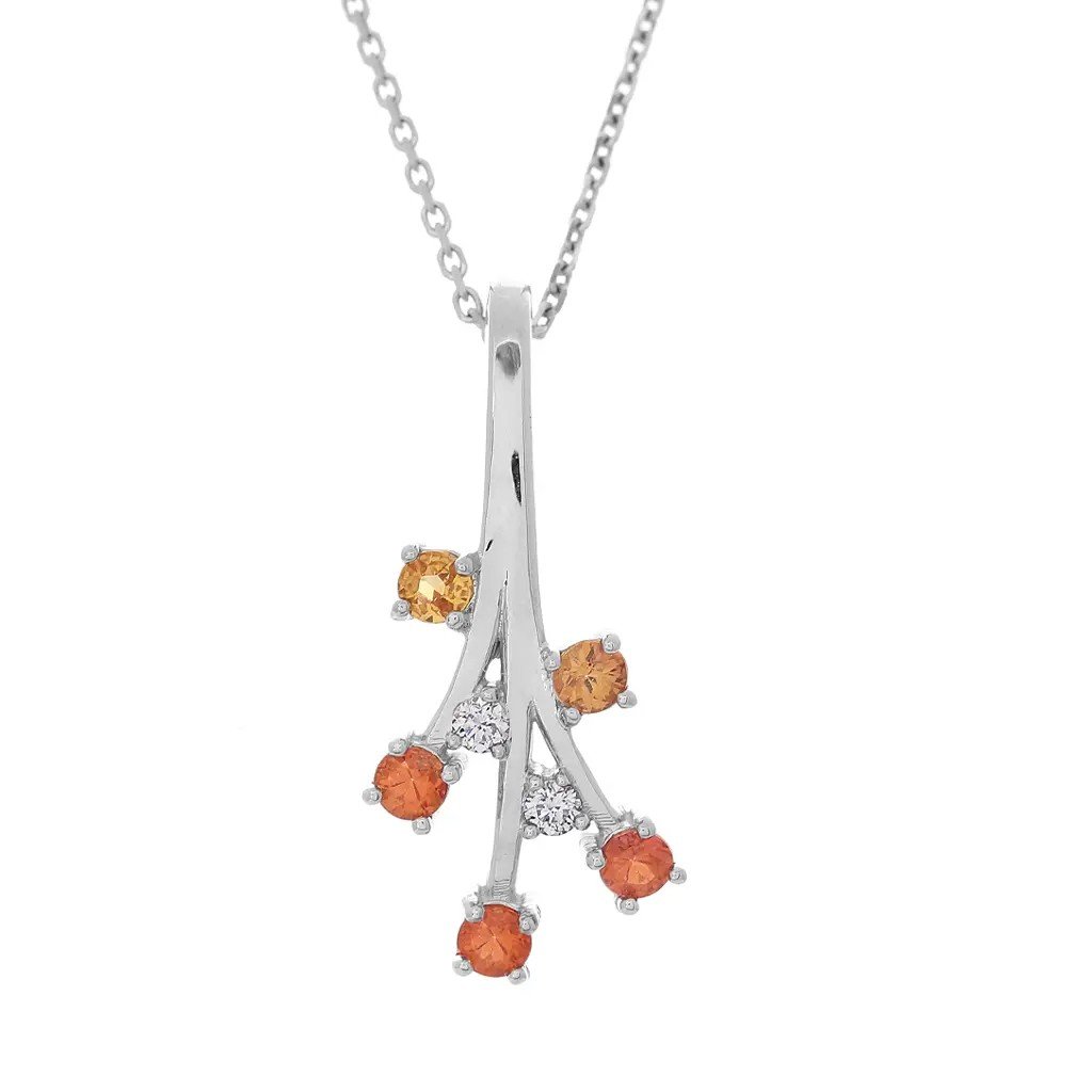 Romantický přívěsek z bílého zlata se safíry v teplých oranžových odstínech a dvěma jiskřivými diamanty. Šperk, který vypráví příběh lásky.
