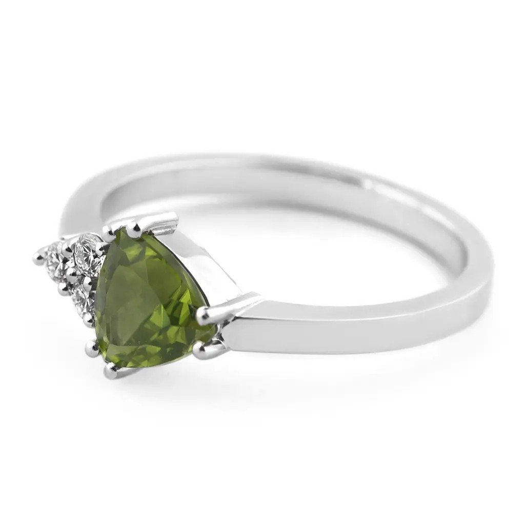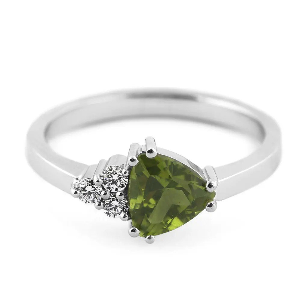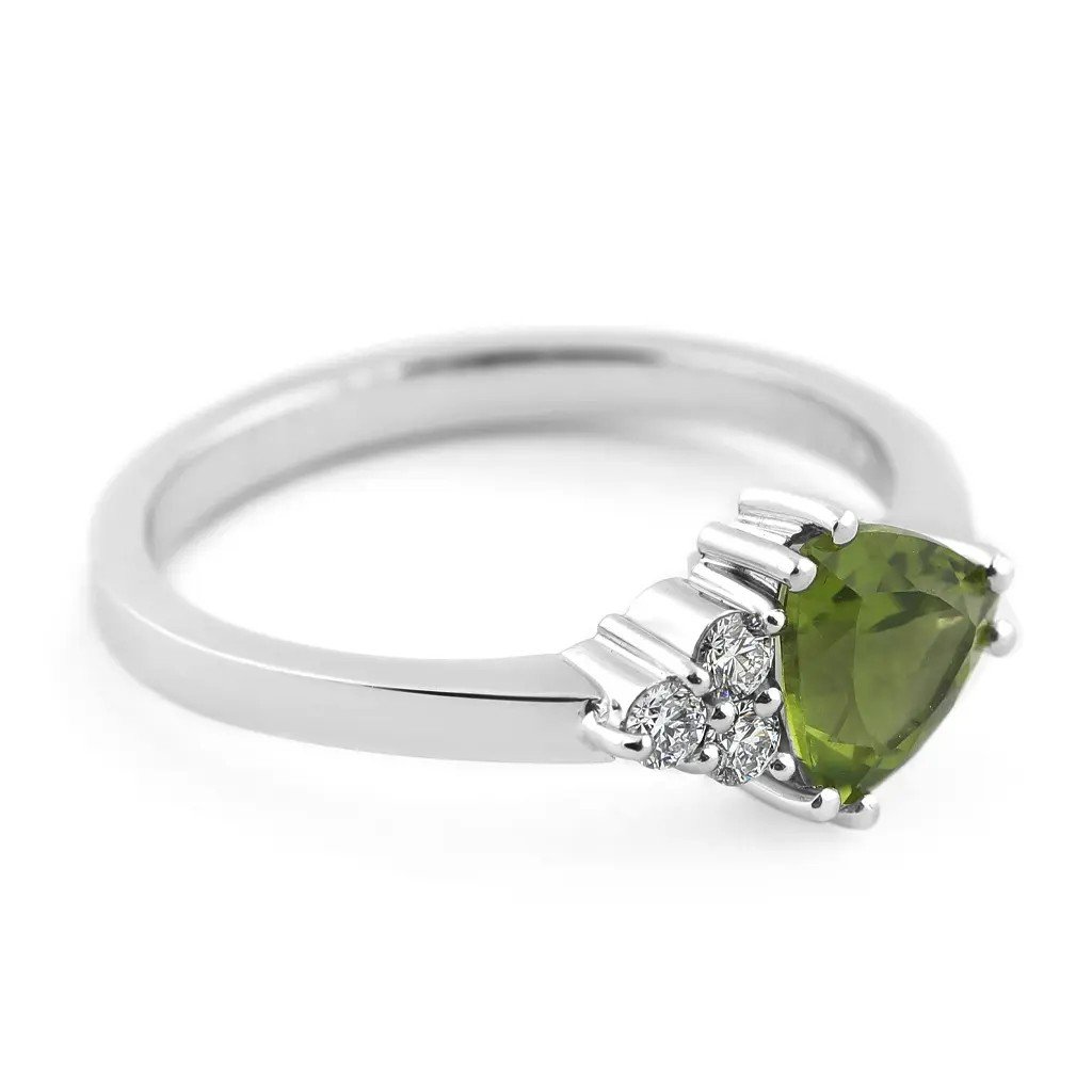 Ručně vyrobený prsten z bílého zlata s přírodním peridotem a třpytivými diamanty, který okouzlí svou elegancí a nadčasovou krásou. Lze doplnit přívěskem a náušnicemi pro jedinečný šperk set.