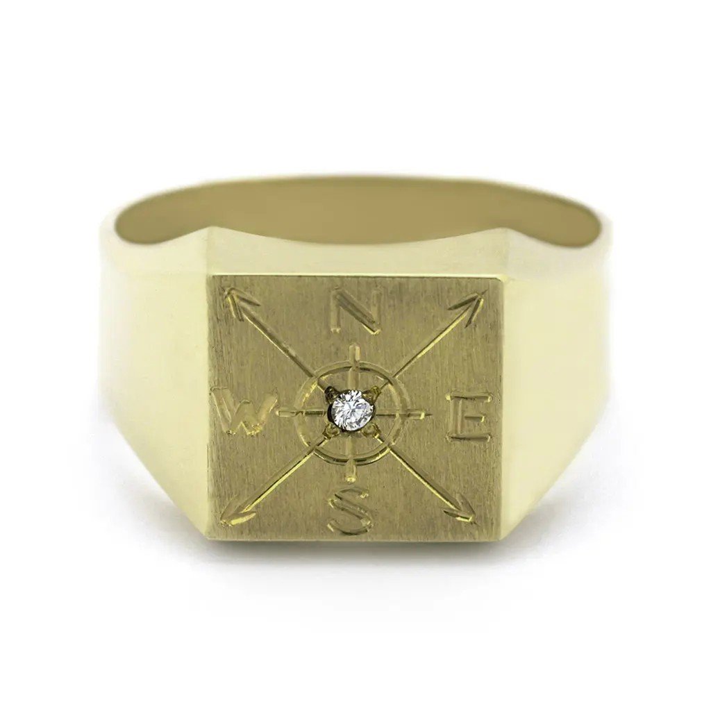 Ručně vyrobený prsten ze žlutého zlata s originálním motivem směrové růžice a centrálním přírodním diamantem. Symbol cesty a lásky.