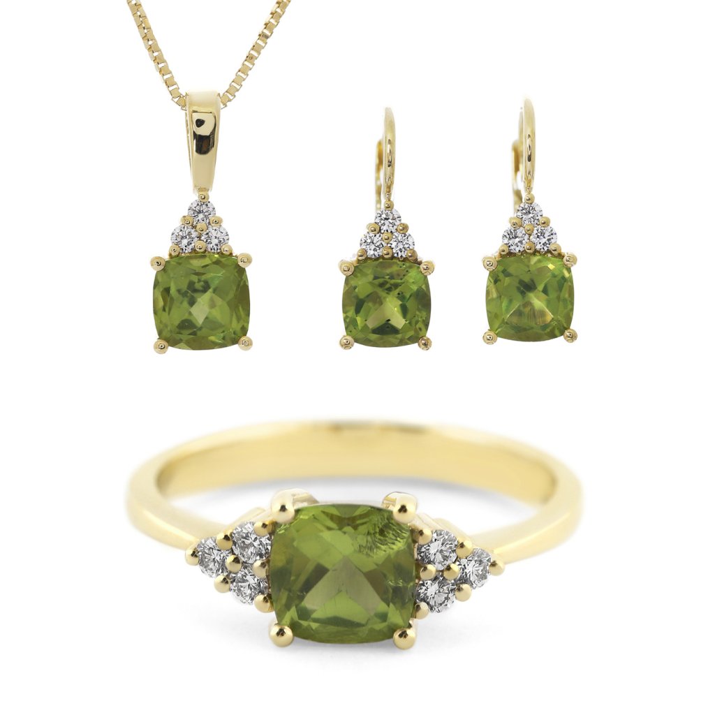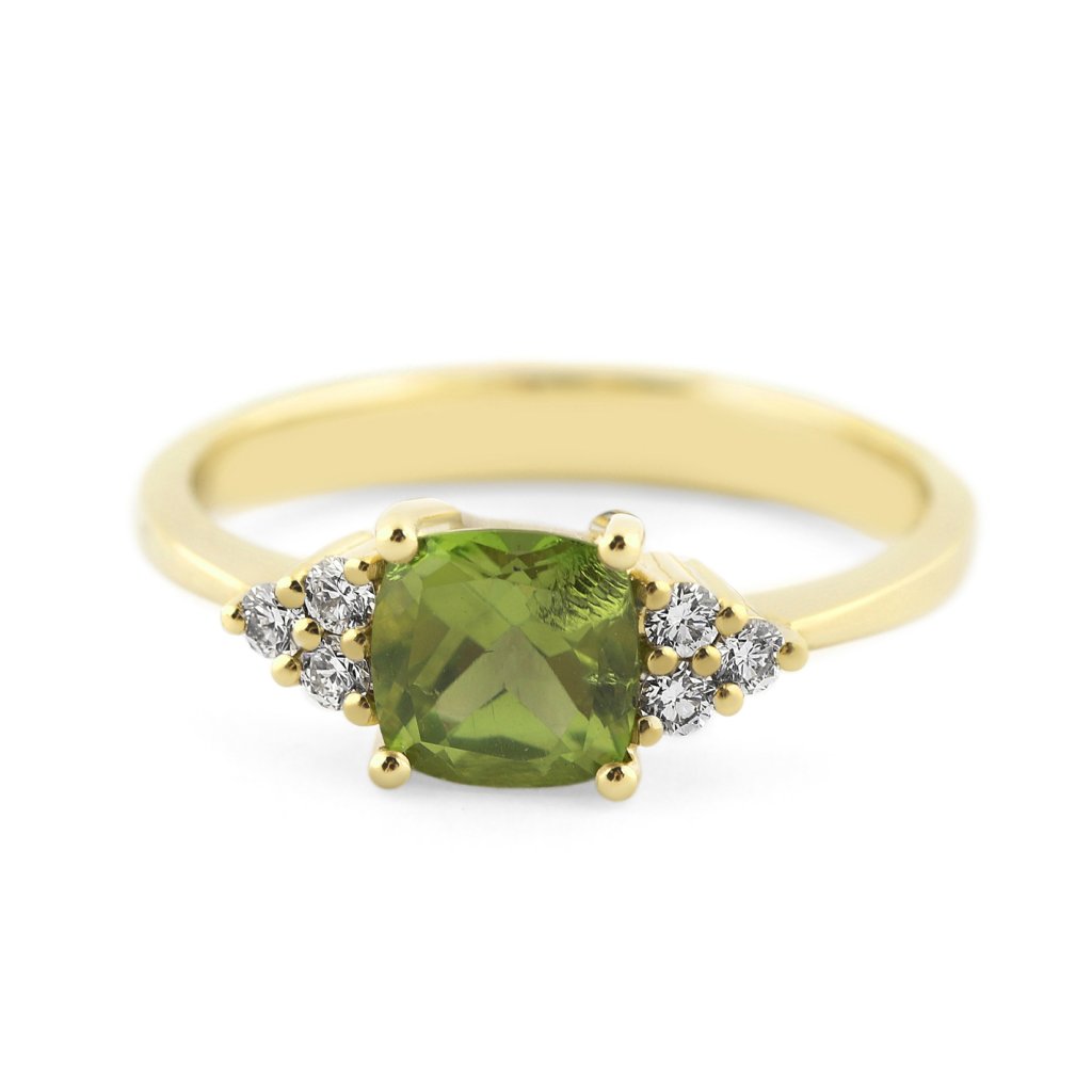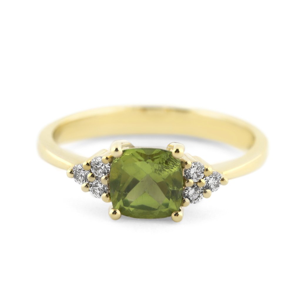Ručně zhotovený prsten ze žlutého zlata ryzosti 585/1000 ve velikosti 55 vyniká precizním osázením a vyváženými proporcemi. Centrální kámen je přírodní peridot o hmotnosti 1,041 ct s rozměry 6x6 mm, jehož fasetovaný brus typu polštářek umožňuje maximální průnik světla a zvýrazňuje jeho transparentnost. Po stranách je šperk doplněn o 6 kusů kulatých briliantů o celkové hmotnosti 0,134 ct. Diamanty jsou vybrány ve vzácně bílé barvě F-G a vysoké čistotě VS, což zajišťuje jejich oslnivý kontrast k nažloutle zelenému olivínu. Čistá váha žlutého zlata v prstenu je 2,94 g a celková hmotnost celého kusu činí 3,17 g.