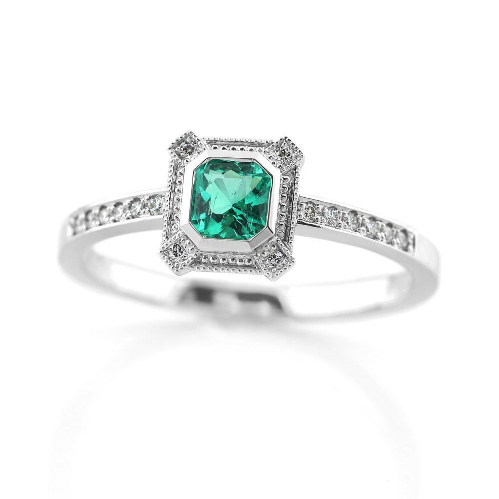 Ručně vyráběný prsten z bílého zlata 585/1000 zdobený přírodním kolumbijským smaragdem a 16 brilantními diamanty. Elegantní, jemně vintage design s luxusním detailem a precizním osazením kamenů.
