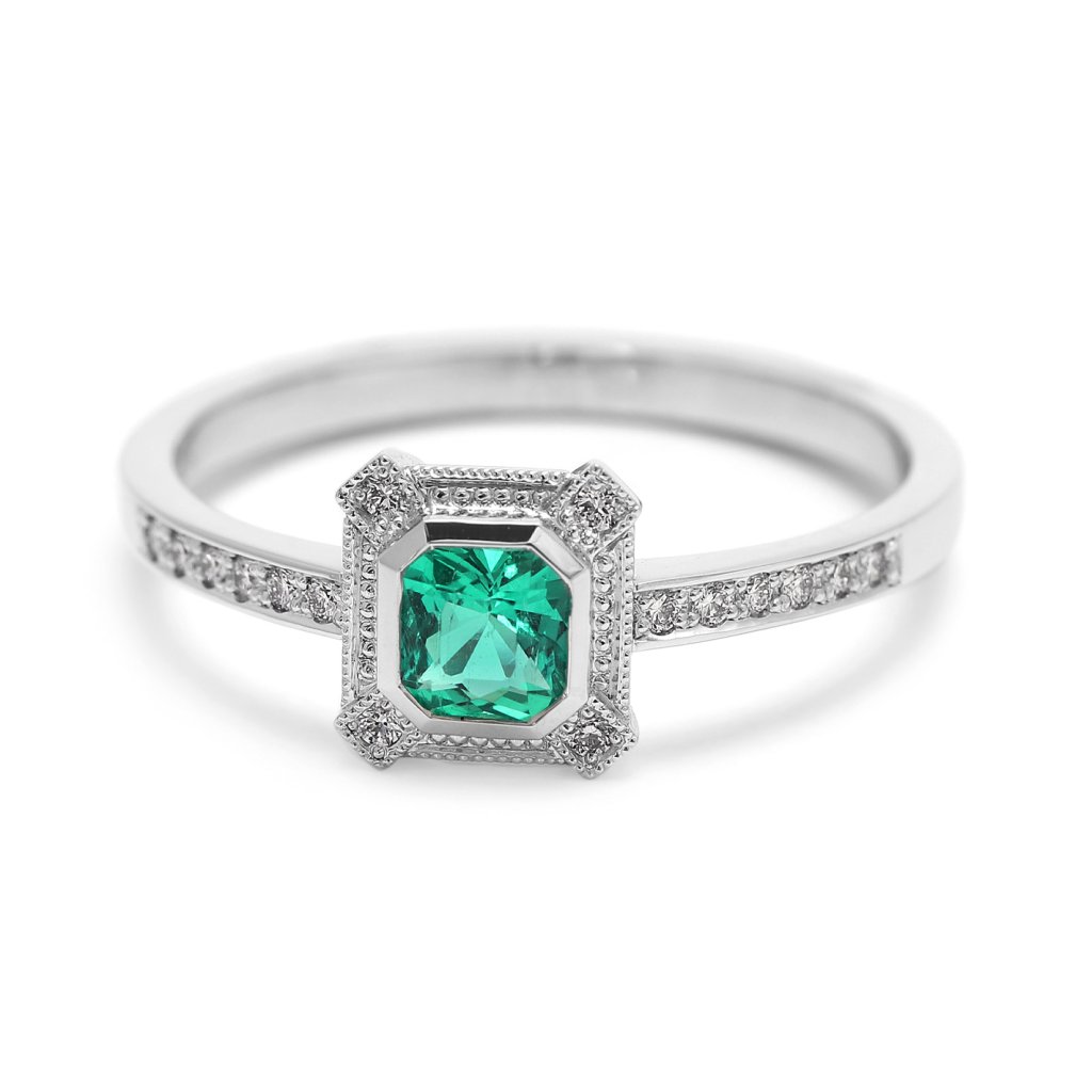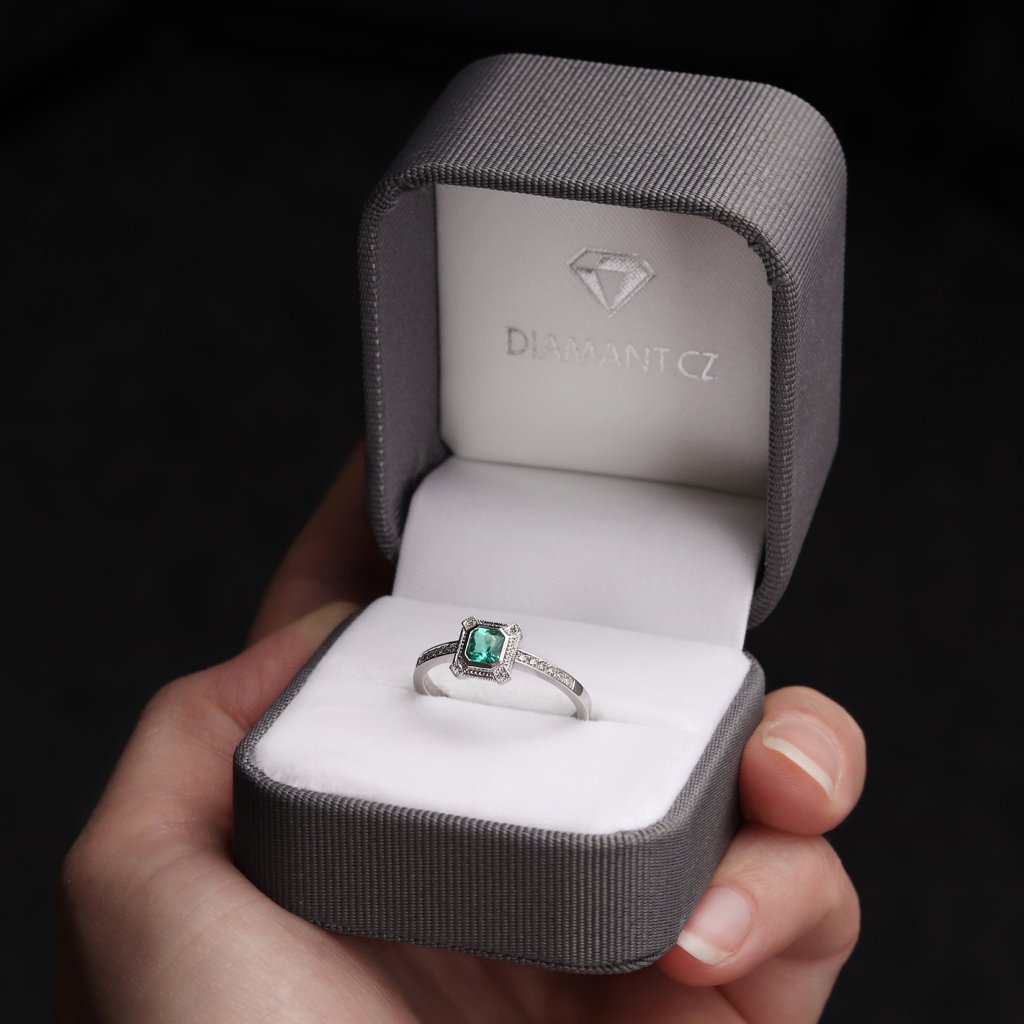 Srdcem šperku je přírodní smaragd původu Kolumbie, který byl odborně hodnocen ještě před zasazením. Tento smaragd má čtvercový stupňový brus (tuporohý) a jeho lehce namodrale zelená, transparentní barva působí mimořádně čistě a svěže. Kámen o rozměrech 4,3 × 4,15 × 2,9 mm a hmotnosti 0,310 ct nese úpravu výplň fisur F1, která je u přírodních smaragdů běžná a zachovává jejich přirozený charakter.