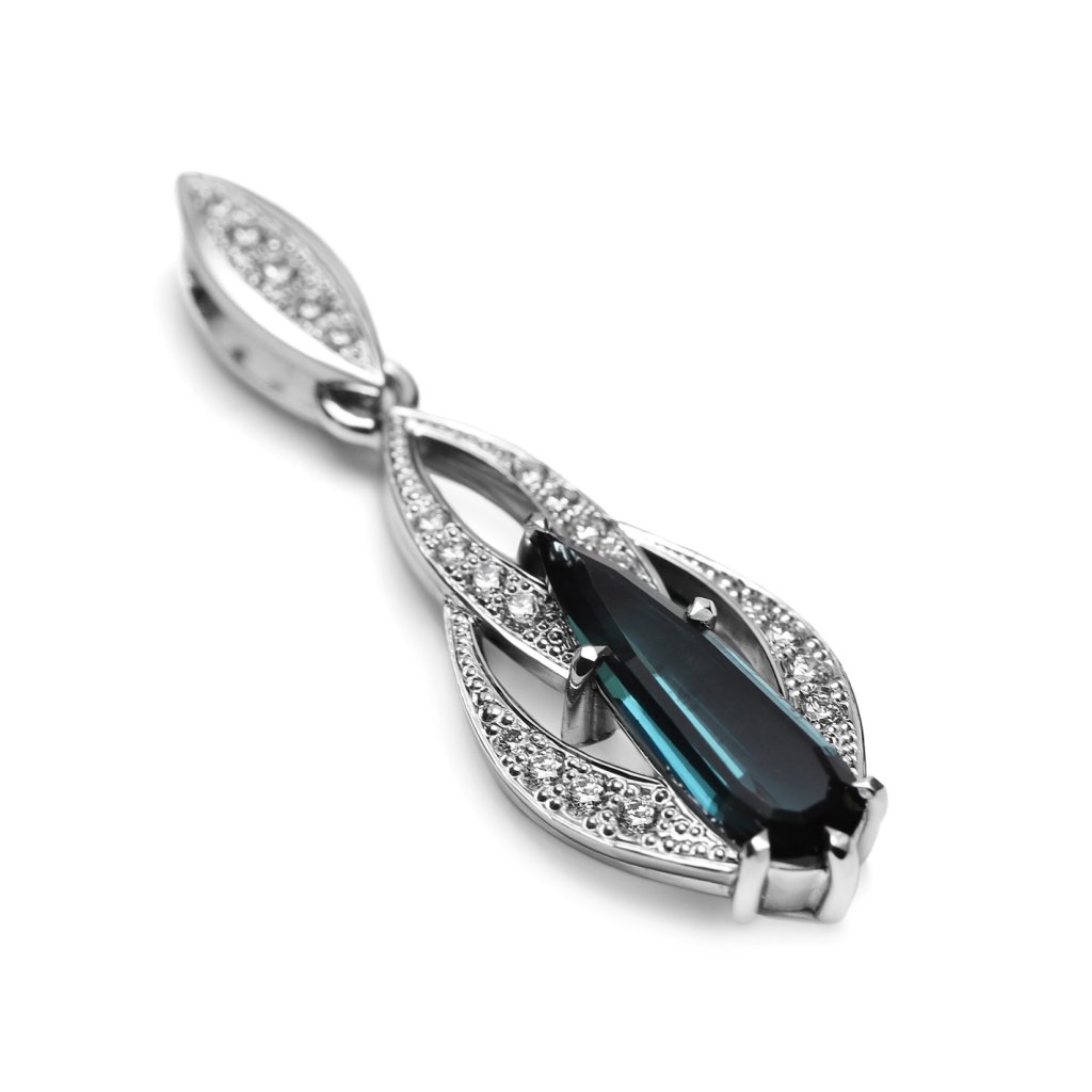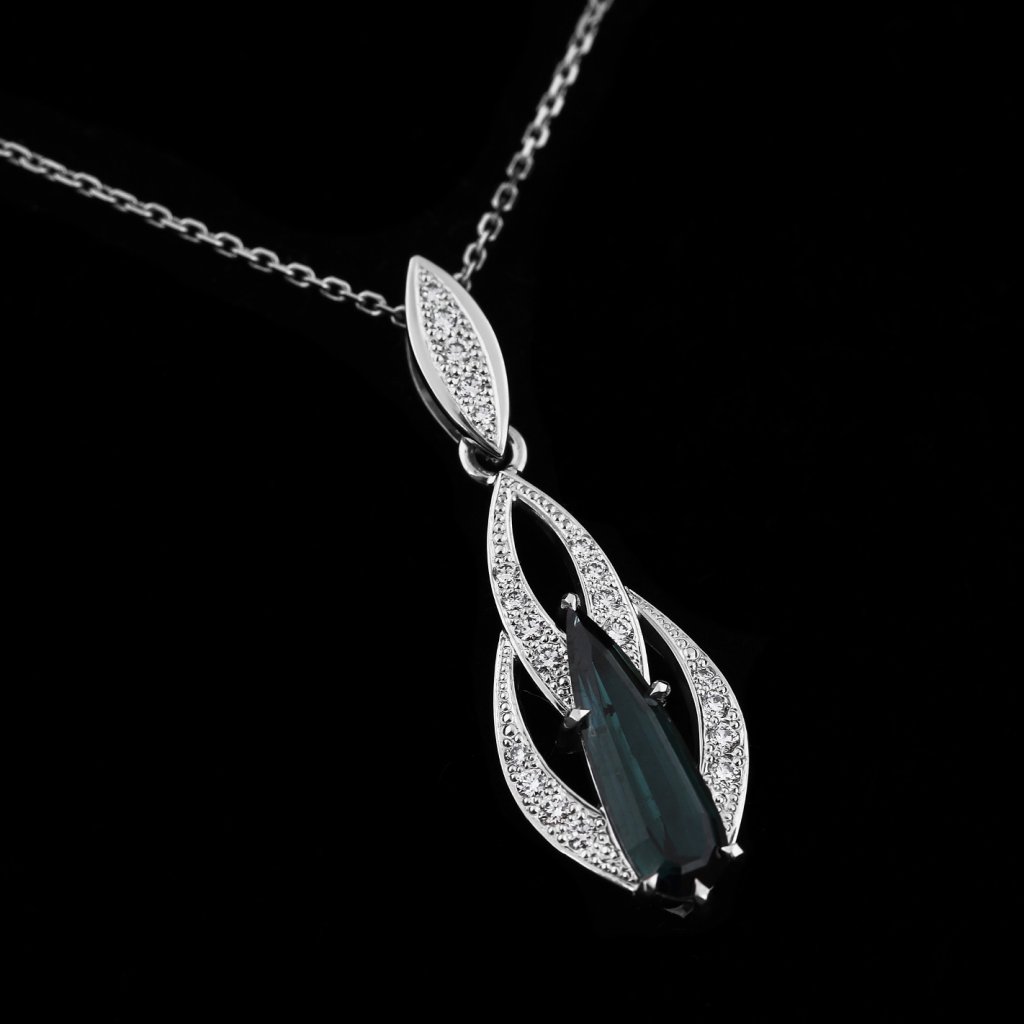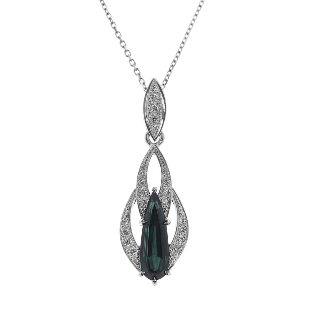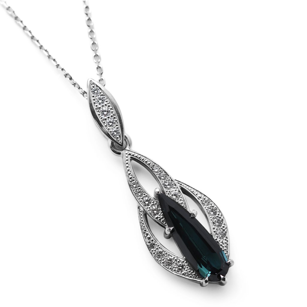 Elegantní přívěsek z bílého zlata 585/1000 zdobený přírodním safírem a dvaceti jedním briliantem. Jemná modrozelená záře, precizní zpracování a nadčasová elegance.