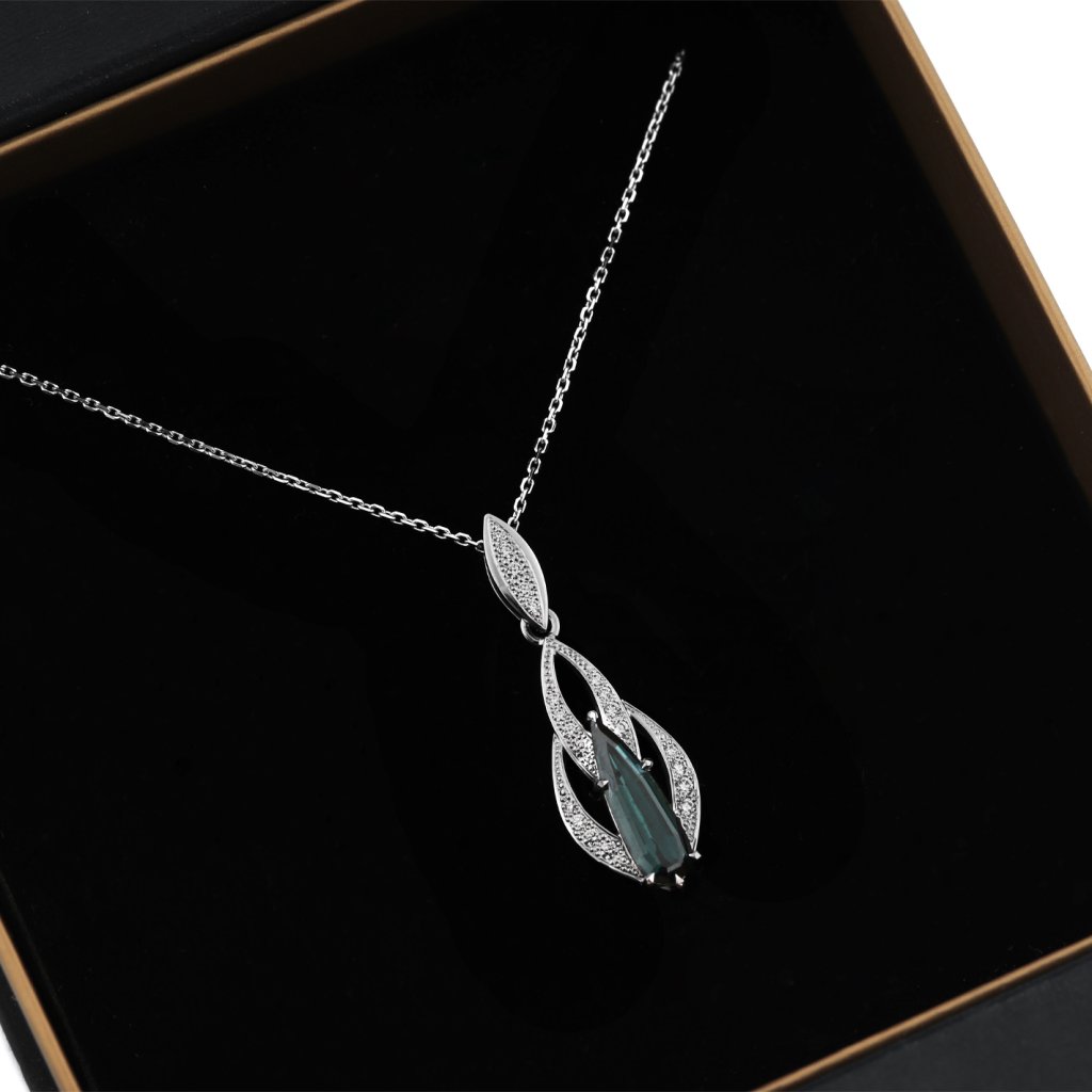 Dominantou šperku je přírodní safír v pantlok kombinovaném brusu, jehož velmi lehce nazelenale modrý, transparentní odstín působí vznešeně a hluboce. Safír má rozměr 13,2 × 4,2 × 2,85 mm, hmotnost 1,415 ct a prošel tepelnou úpravou (TE), která zvýraznila jeho barvu a čistotu. Jeho podlouhlý tvar dodává přívěsku elegantní linii a jemně prodlužuje celkový tvar šperku.