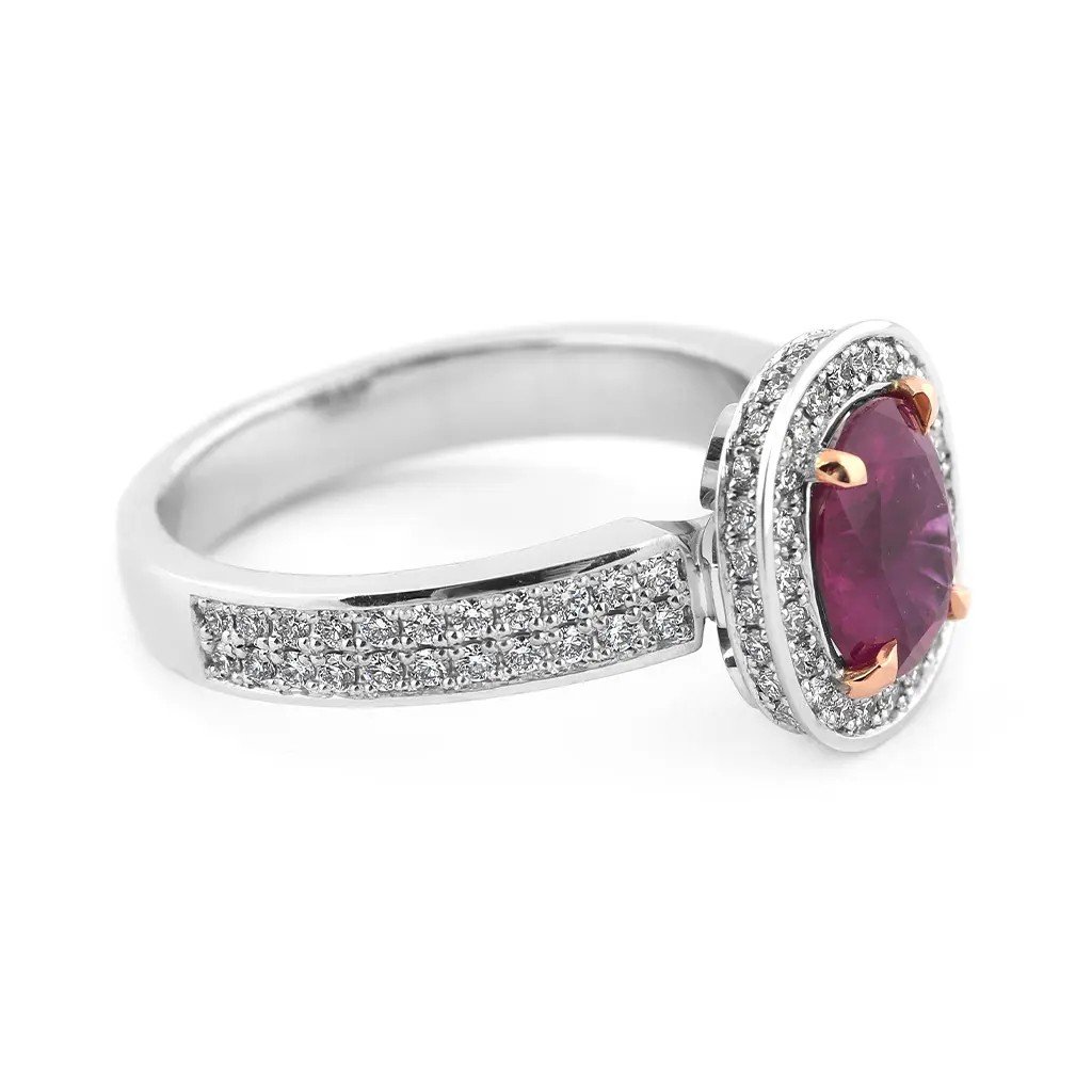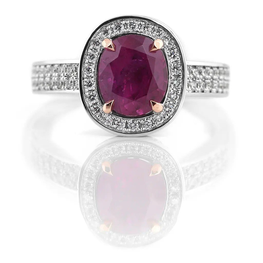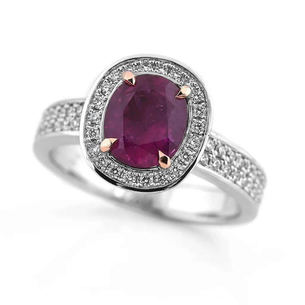 Ručně vyrobený prsten z bílého a červeného zlata 585/1000 s oválným rubínem 2,076 ct a 92 diamanty 0,562 ct. Elegantní, luxusní a nepřehlédnutelný šperk pro výjimečné okamžiky.