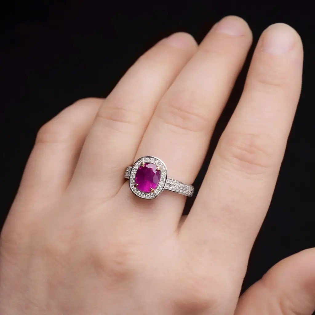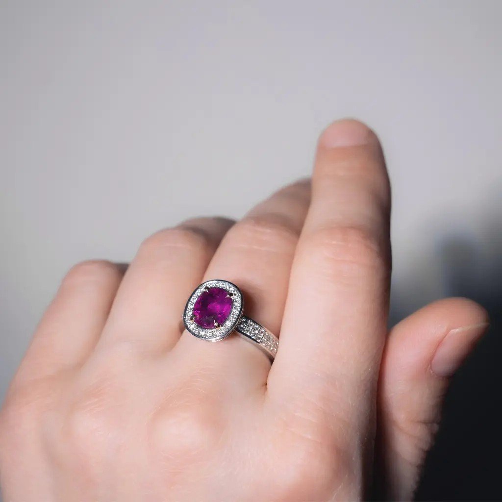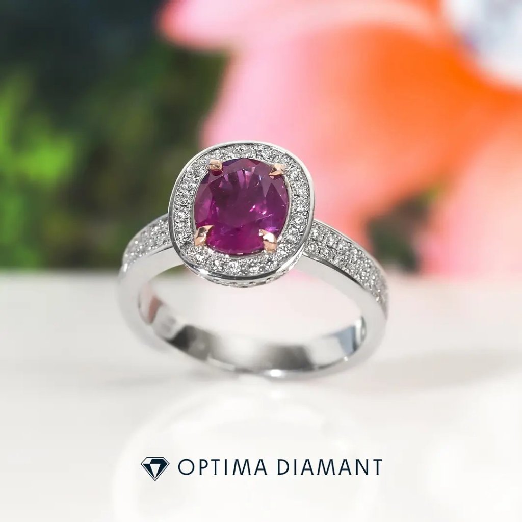 Ručně vyrobený prsten z bílého a červeného zlata 585/1000 s oválným rubínem 2,076 ct a 92 diamanty 0,562 ct. Elegantní, luxusní a nepřehlédnutelný šperk pro výjimečné okamžiky.