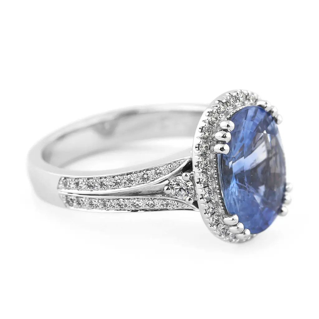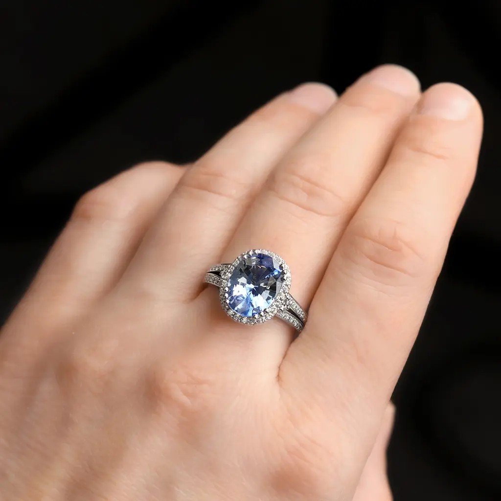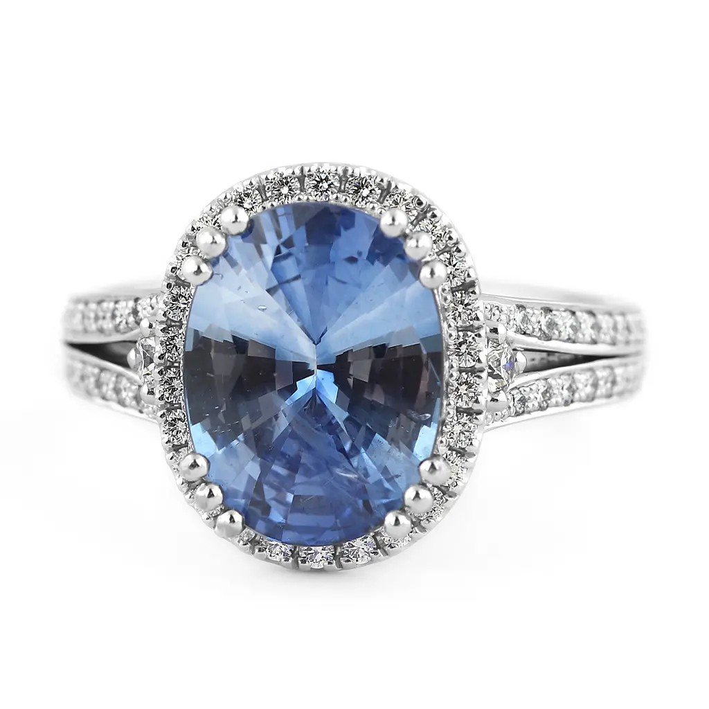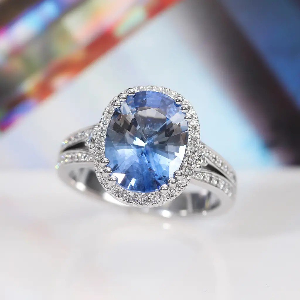 Každý šperk má svůj příběh a tento prsten z bílého zlata (Au 585/1000, 6,29 g) je vyprávěn modrým safírem o hmotnosti 4,338 ct. Safír, původem ze Srí Lanky, má jemný světle modrý odstín a svou průzračností připomíná klidnou hladinu oceánu. Jeho oválný tvar o rozměrech 12,15 × 9,25 × 5,25 mm působí jako okno do světa snů a nekonečné hloubky.