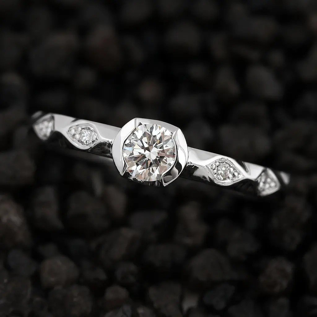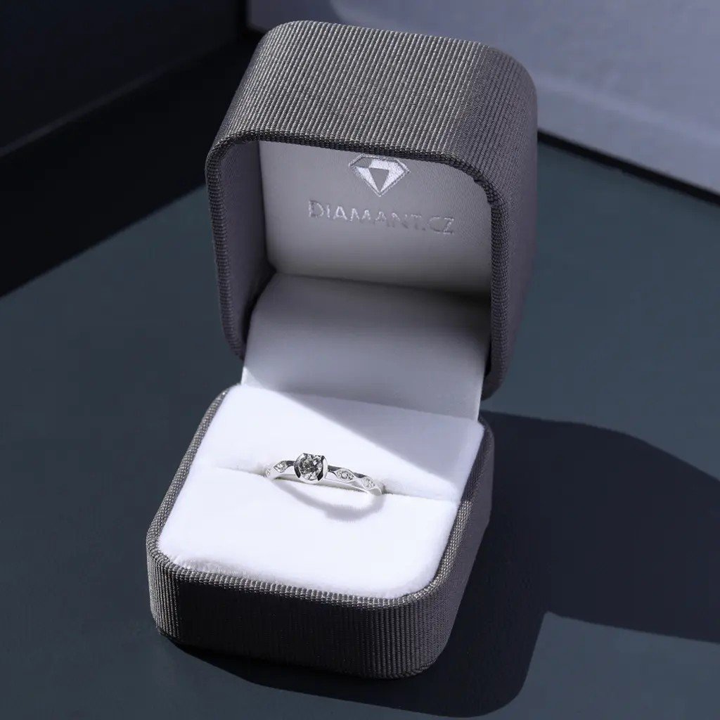 Dominantou je přírodní kulatý diamant o průměru 4,25 mm a hmotnosti 0,297 ct. Jeho vzácně bílá barva (F–G) a čistota SI1 dodávají šperku oslnivý třpyt, který připomíná jasný záblesk lásky. Čtyři drobné brilianty o celkové hmotnosti 0,044 ct obklopují hlavní kámen jako hvězdy, které podtrhují jeho krásu.