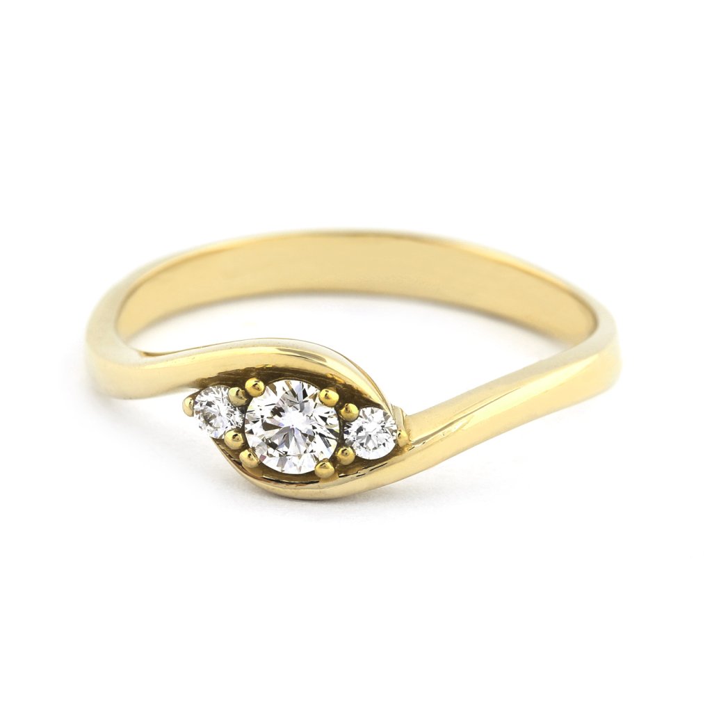 Tento nadčasový prsten z čtrnáctikarátového žlutého zlata je oslavou jednoduché elegance a jemné krásy. Uprostřed prstenu září přírodní diamant kulatého briliantového brusu, bílý (H) a čistoty SI1, s průměrem 3,35 mm a hmotností 0,138 ct, doplněný o dva bílé diamanty v celkové hmotnosti 0,054 ct a velikosti ø 1,85 mm. Jeho třpyt symbolizuje jemnost okamžiků, které stojí za to uchovat, a dodává šperku neobyčejný půvab.