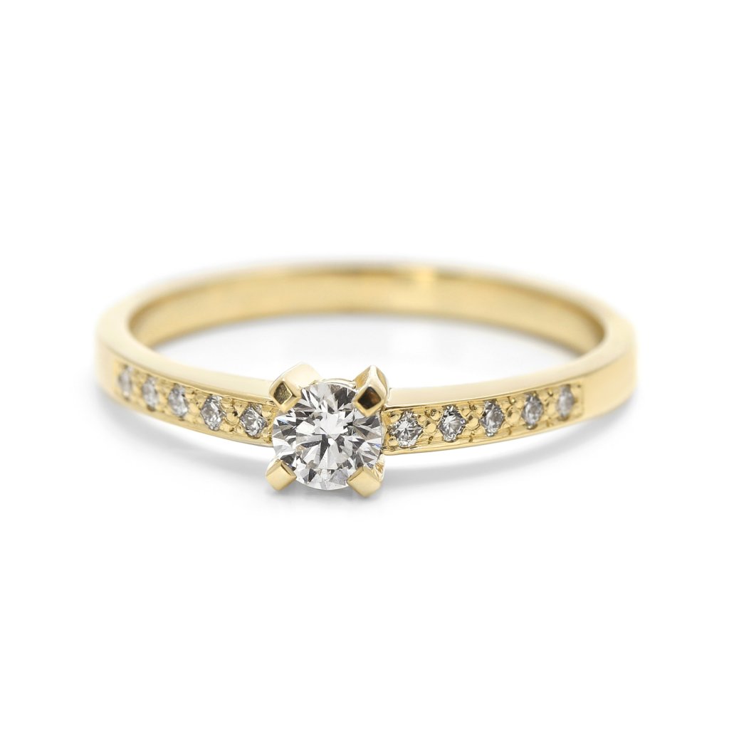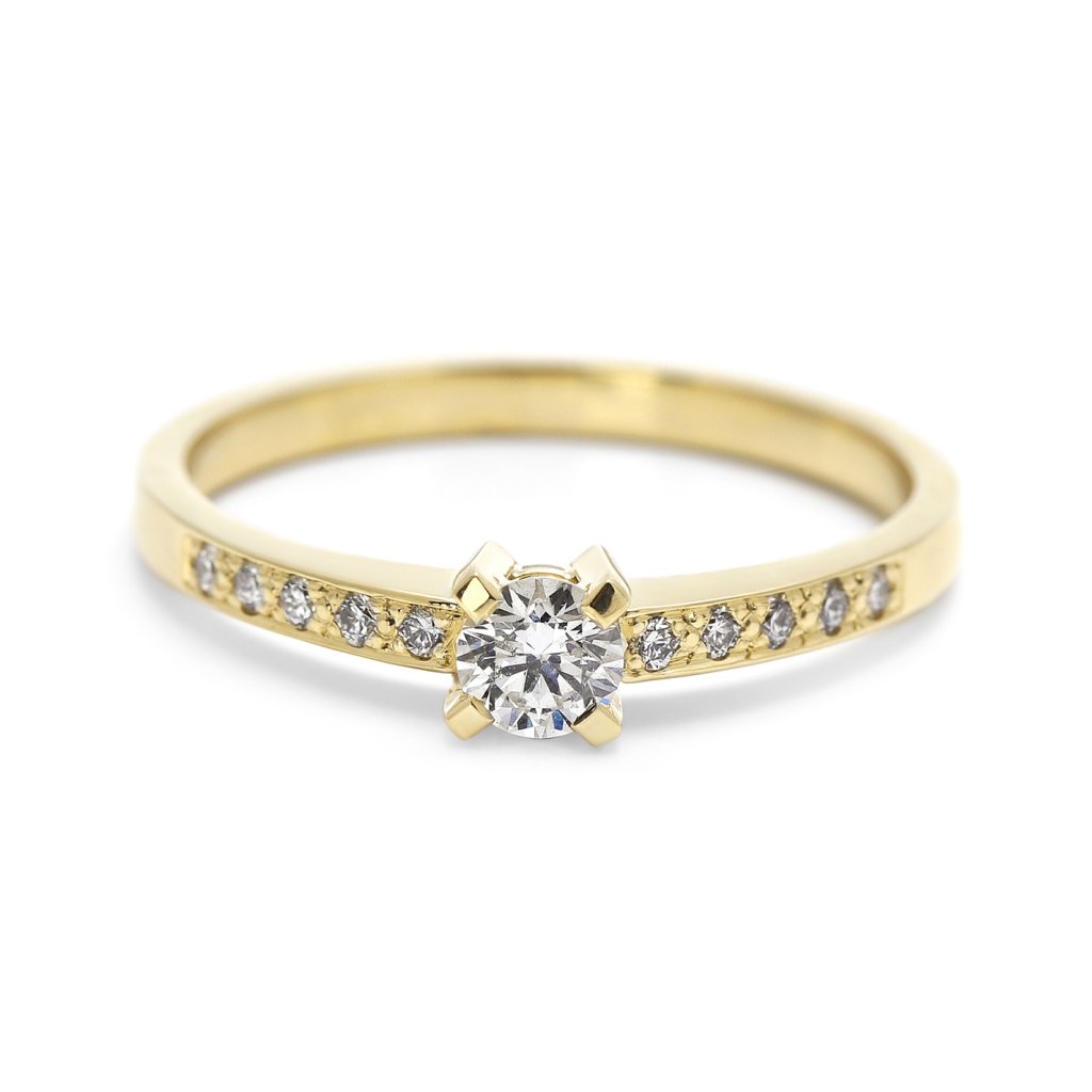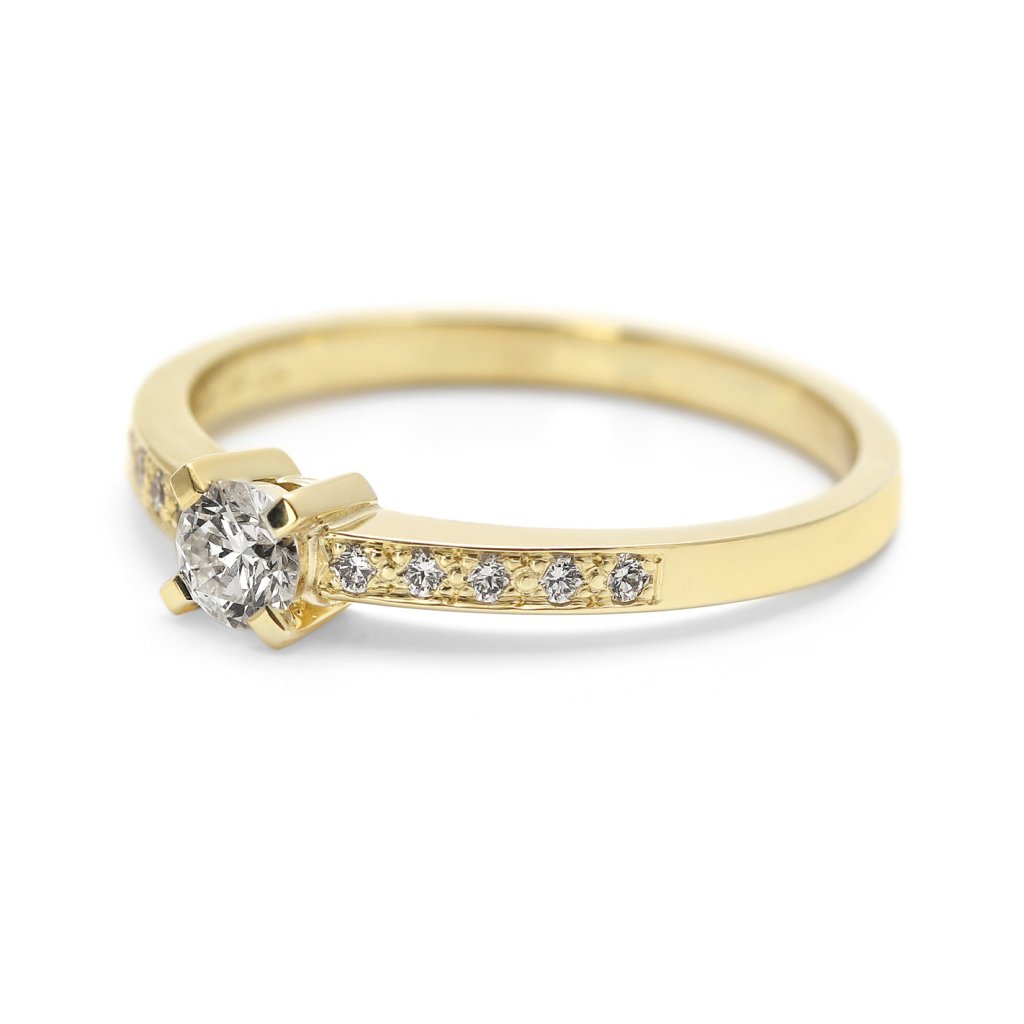 Zásnubní prsten ze žlutého zlata s diamantovým solitérem a linií brilance, vel. 56